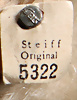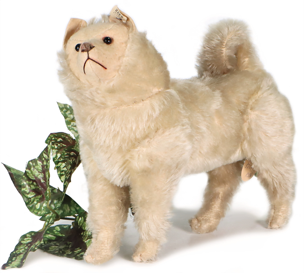 SPITZ, Artikel-Nr. 5322, hergestellt 1906, mit Knopf, Druckbuchstaben, langgezogenes f, sehr gut erhaltene weiße Papier-Fahne, Aufschrift: Steiff Original 5322, Filz-Einsatz in Gesicht und Ohren, Schuhknopfaugen, 5-fach gegliedert, gekräuselter Schwanz, minim. kl. Kahlstelle am rechten Hinterlauf, sonst sehr schöner unbespielter Zust., H: 21 cm, L: 26 cm, Handmuster aus dem Steiff-Archiv mit orig. Steiff-Archiv Anhänger
