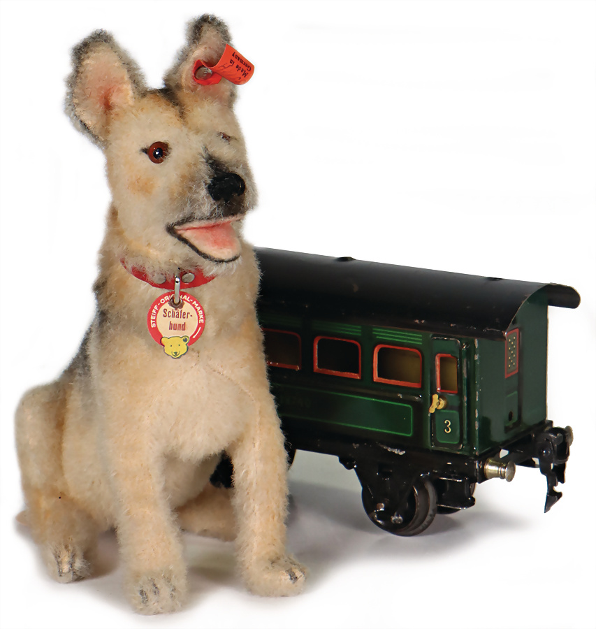 In den Stummfilmen der 1920er Jahre erregte "Rin Tin Tin" der Schäferhund großes Aufsehen. In den 1950er Jahren kehrte erneut ein Schäferhund als Leinwand-Star in der amerikanischen Serie "Strong Heart" zurück. Beliebt war er vor allem als Arbeits- und Herdenhund und später auch als Polizei- und Schutzhund. Er steht als Sinnbild für Treue, Mut und Leistungsfähigkeit. Die Firma Steiff produzierte den ersten deutschen Schäferhund als Polizeihund, in Amerika unter dem Namen „Sergeant Police Dog“. Hier ein einmaliges Exemplar aus dem Steiff-Archiv in unbespieltem Zustand.