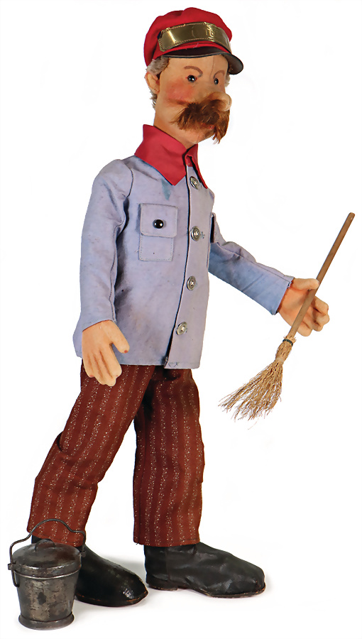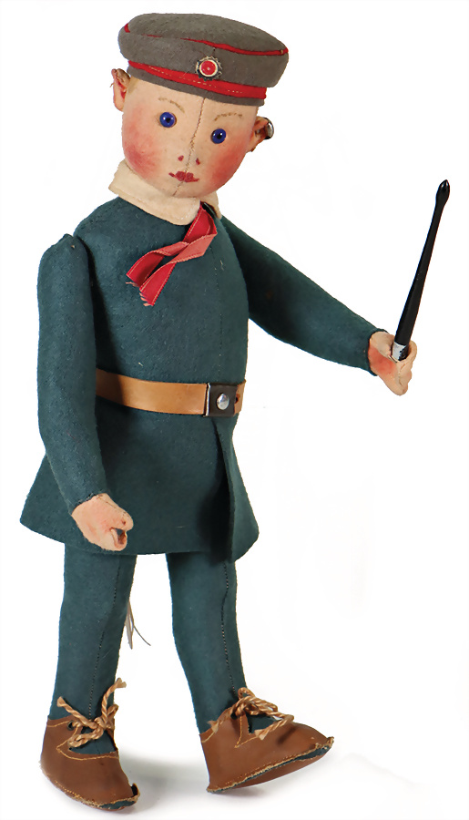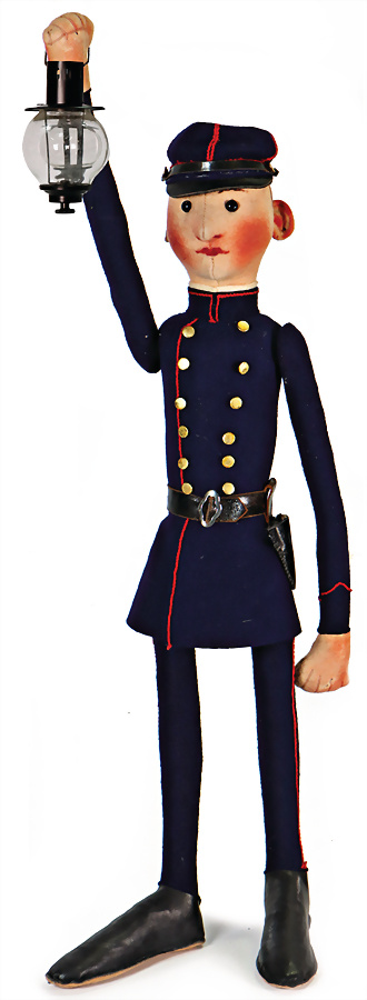 ...ich liebe diese drolligen Karikaturpuppen! Karikaturen wurden im Spielzeugbereich des frühen 20. Jahrhunderts als humorvolle Überzeichnung typischer Klischees und Berufsbilder der Zeit verwendet. Sie sollten lustig, klischeehaft und exzentrisch wirken und jung und alt amüsieren. Sie brachten den Kindern Freude & Spaß und prägten zugleich die dominierenden Rollenbilder der Zeit. Die langen Gliedmaßen und oftmals stark ausmodellierten Nasen unterstreichen den Karikatur-Charakter der Puppe. Hier ein Exemplar in hervorragendem Zustand! Läßt der schelmische Polizist auch Ihr Herz höher schlagen?