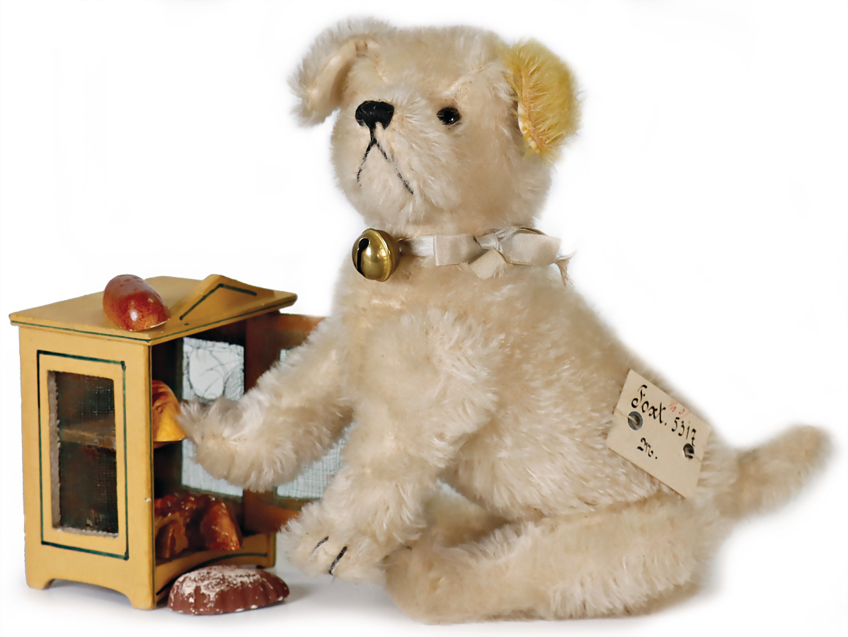 CHEERIO, Artikel-Nr. 1328,02, hergestellt am 31.08.1928, eines der Highlights der Steiff Auktion, Musterstück, mit Knopf, Druckbuchstaben, langgezogenes f, unberührte rote Fahne, Nr. auf Fahne: 1328,02, auf 4 Beinen, drehbarer Kopf, eingesetzte Glasaugen, off. Mund, Samt-Schnauze mit Zunge, 2 Brustschilder, 1x Brustschild mit Metall-Rahmen Aufschrift: Cheerio Steiff-original, sowie Brustschild mit roter Aufschrift: Cheerio, H: 26 cm, L: 26 cm, Seidenschleife etwas verschlissen, sonst sehr schöner orig.-Zust., Handmuster aus dem Steiff-Archiv mit orig. Steiff-Archiv Anhänger
