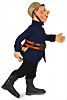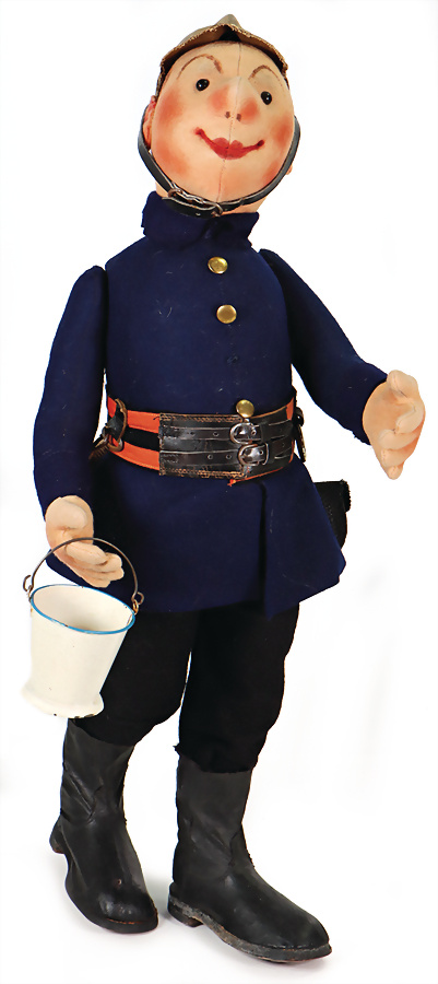 Feuerwehrmann, Artikel-Nr. 50, hergestellt 1912, mit Knopf, Druckbuchstaben, langgezogenes f, Papiermaché-Helm, Schuhknopfaugen, sehr ausdrucksstarkes Airbrush mit lächelndem Gesicht und stark ausmodell. Nase, Filz-Kleidung, Gürtel mit Axt und Seil, Stiefel bespickt mit 34 orig. Steiff-Knöpfen, 52 cm, ausdrucksstark, Handmuster aus dem Steiff-Archiv mit orig. Steiff-Archiv Anhänger