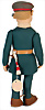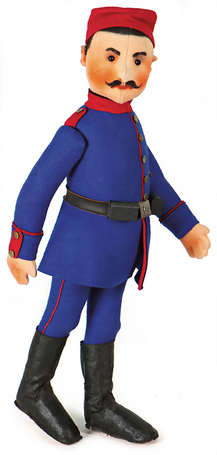 Filz-Puppe, belgischer Soldat, Artikel-Nr. 35, hergestellt 1914, mit kl. Steiff Knopf, Schuhknopfaugen, sehr schönes deutliches Airbrush, errötete Wangen, Ober- und Unterlippenbart, schwarze gemalte Haare, dunkelblaue Filz-Uniform mit goldener Doppelknopf-Reihe, übergroße Lederschuhe, passende Filz-Mütze mit Papp-Abzeichen, handschriftlich: Nr. 11, 35 cm, unbespielter sehr schöner Zust., Handmuster aus dem Steiff-Archiv mit orig. Steiff-Archiv Anhänger