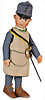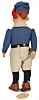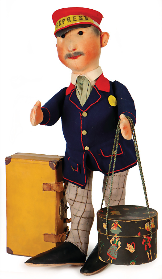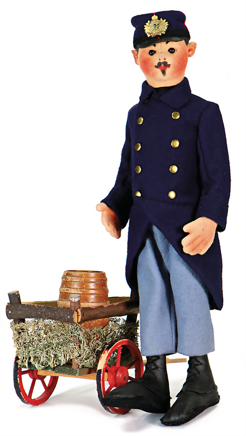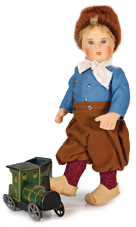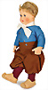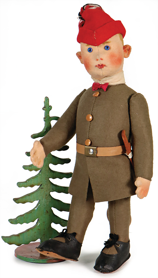 Figur, BAREND, Artikel-Nr. 35, hergestellt am 23.12.1938, Musterstück, hergestellt ohne Knopf, Schild und Fahne, fest eingesetzte blaue Glasaugen, aufgesetzte Mohair Haare und Mütze, Leinen-Bluse, Filz-Pantoletten, H: 34 cm, unbespielter Zust., Handmuster aus dem Steiff-Archiv mit orig. Steiff-Archiv Anhänger