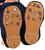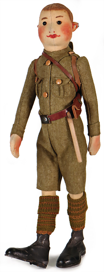 Filz-Puppe, "Jugendwehr", Artikel-Nr. 35, hergestellt 1913, Musterstück mit Muster-Knopf am Ohr, Schuhknopfaugen, deutl. Airbrush, aufgemalte Haare, minim. kl. Fehlstelle über der linken Schläfe, khakifarbene Filz-Kleidung mit Gürtel, Tasche, Trinkflasche und Rucksack, übergroße Lederschuhe, Strick-Stulpen, sehr schöner Ausdruck, selten, 35 cm, Handmuster aus dem Steiff-Archiv mit orig. Steiff-Archiv Anhänger