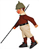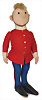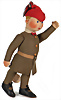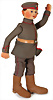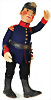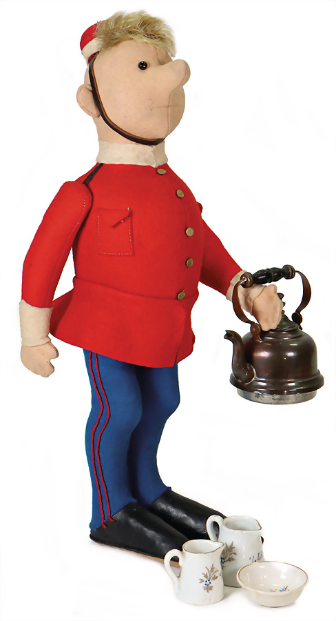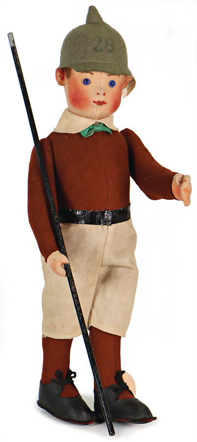 Filz-Puppe, karikierter englischer Soldat, Artikel-Nr. 35, hergestellt 1911, mit gr. Muster-Knopf, Schuhknopfaugen, kl. Mohair Pony, kl. niedlicher Filz-Hut, stark ausmodell. Nase, Filz-Uniform mit goldenen Knöpfen, aufgenähte Taschen, 1 Knopf auf der rechten Brusttasche fehlt, übergroße Lederschuhe, 35 cm, kl. Fehlstelle am linken Jackensaum, sonst unbespielter Zust., Handmuster aus dem Steiff-Archiv mit orig. Steiff-Archiv Anhänger