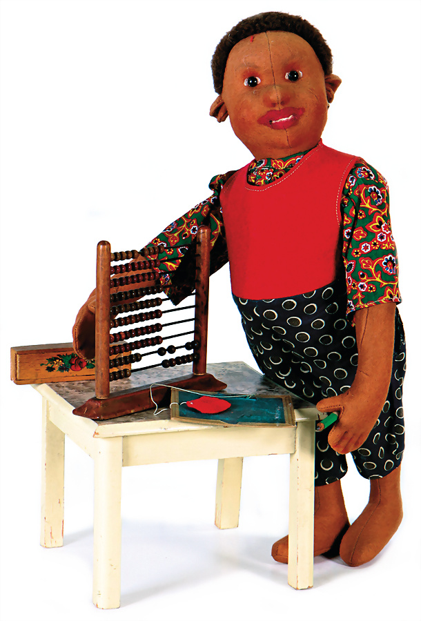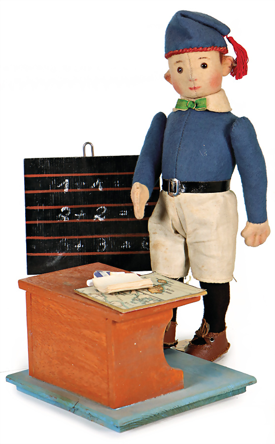 Steiff produzierte ab den frühen 1910er Jahren auch komplette Schulen. Sehr selten ist die amerikanische Dorfschule mit Lehrer und schwarzen Schulkindern. Hier ein Schüler dieser Dorfschule in unglaublich gutem Zustand.