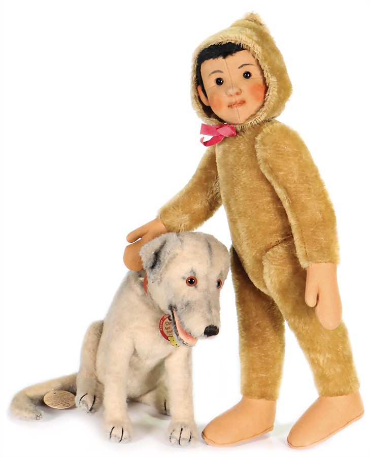 Puppe ESKIMO, Artikel-Nr. 43, hergestellt 1908, eines der Highlights der Steiff-Auktion, Eskimo Kind, mit Knopf, Knopf etwas angelaufen, minim. Reste der weißen Fahne, Schuhknopfaugen, deutl. Airbrush im Gesicht, schwarze Mohair-Haare, Mohair-Anzug, Filz-Handschuhe, sowie Schuhe, kl. Seidenschleife, unbespielter orig.-Zust., 42 cm, außergewöhnlich, extrem selten, Handmuster aus dem Steiff-Archiv mit orig. Steiff-Archiv Anhänger