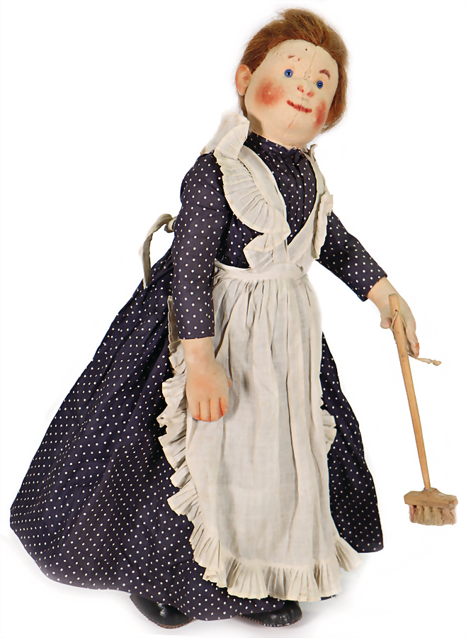 Diese Filzpuppe eines Stubenmädchens ist eine Rarität! Sie hat einen Gliederkörper der sehr selten bei diesen frühen Filzpuppen ist. Diese konnten vor allem als Ausstellungstücke in Verkaufsläden gut dekoriert werden, da die Gliederkörper eine Darstellung in einer bestimmten Position, wie hier kehrend oder sitzend, erlaubte.