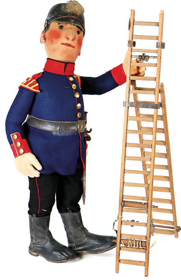 ...Ein seltenes Schaustück, hergestellt zur Nachbildung des großen Feuers in Dingharting im Jahr 1912, wurden die Puppen mit aufwendig gearbeiteten Papier-Messing Helmen und reichlich Zubehör ausgestattet, in der Gesamterscheinung ein beeindruckendes Objekt aus dem Steiff Archiv...