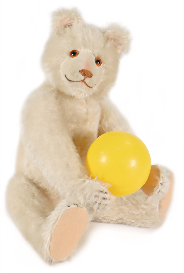 DICKY-BÄR, Artikel-Nr. 5317,2, hergestellt am 20.01.1931, eines der Highlights der Steiff Auktion, weißer lächelnder DICKY, mit deutl. Airbrush-Bemalung, helle Glasaugen, weißes Mohair, leicht rosa getönt im Innenohr, lange abgeknickte Arme, Filz-Tatzen, 27 cm, Handmuster aus dem Steiff-Archiv mit orig. Steiff-Archiv Anhänger