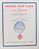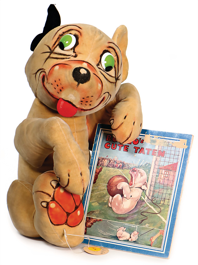 ausgefallener BONZO in ausgesprochen großer Größe, Artikel-Nr. 5425, hergestellt 1927-1928, eines der Highlights der Steiff-Auktion, Samt, karikierter Hund mit Airbrush-Bemalung sowie grüne Schielaugen, Filz-Zunge, unbespielter orig.-Zust., Museumsstück, aus dem Steiff-Archiv nummeriert mit 24 am Po, Sitzhöhe: 31 cm, Stehhöhe: 34 cm, mit kl. orig. BONZO-Heftchen mit Signatur, sowie Margarete Steiff Stempel vom 01.07.1927, Handmuster aus dem Steiff-Archiv mit orig. Steiff-Archiv Anhänger