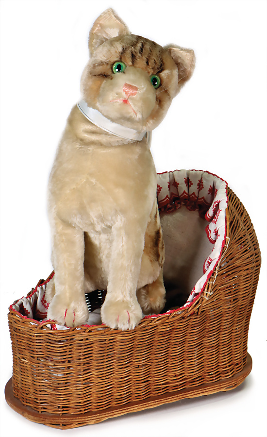 außergewöhnlich große KITTY Katze mit Halsdreh-Mechanik, Artikel-Nr. 3335,2 H, hergestellt am 27.02.1931, gr. grüne Glasaugen, gestromeltes Mohair, mit orig. Steiff Halsdreh-Mechanik Plakette am Schwanz, H: 40 cm, ausdrucksstark, unbespielter Zust., Handmuster aus dem Steiff-Archiv mit orig. Steiff-Archiv Anhänger