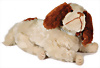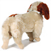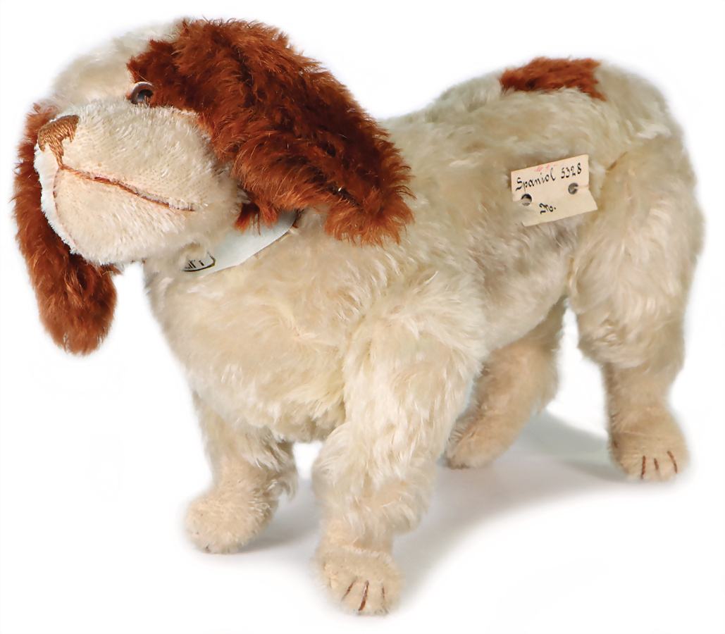 Hund " Spaniol ", Artikel-Nr. 5328, hergestellt 1913, eines der Highlights der Steiff Auktion, Musterstück mit Papier-Etikett seitl. am Bauch, Aufschrift Nr. 9 Spaniol 5329 M., mit Knopf, weiße unbespielte Papier-Fahne, Nr. auf Fahne: 5328, hellblaue Seidenschleife, mit nach oben gerichtetem drehbarem Kopf, bewegl. Beine, schönes volles beiges und rostbraunes Mohair, Glasaugen, unbespielter Zust., H: 30 cm, L: 40 cm, Handmuster aus dem Steiff-Archiv mit orig. Steiff-Archiv Anhänger
