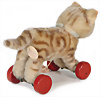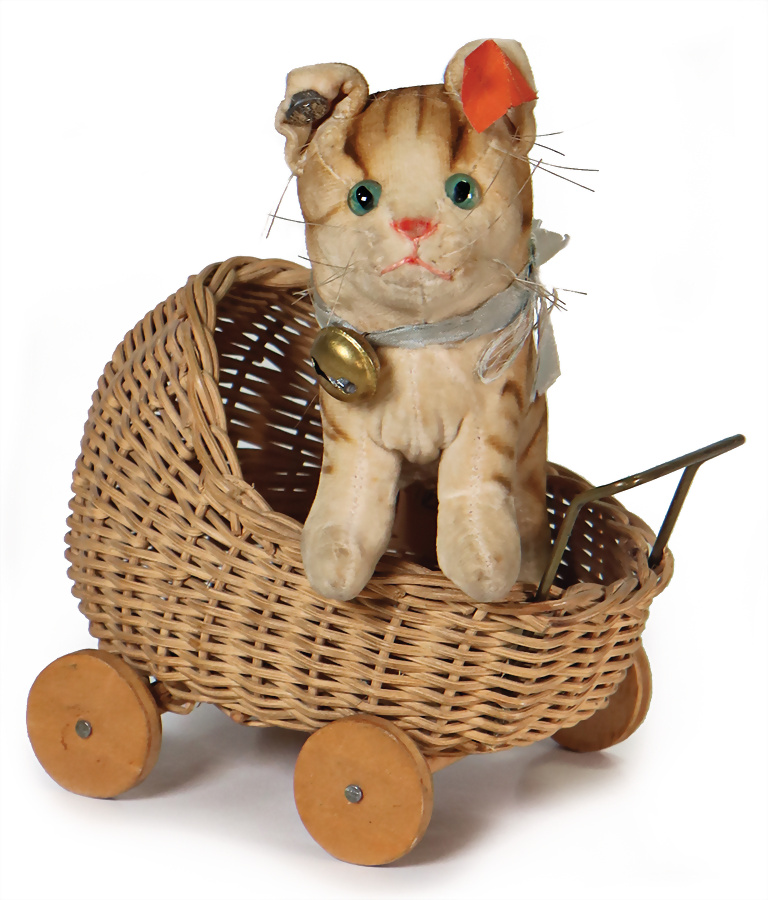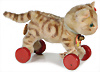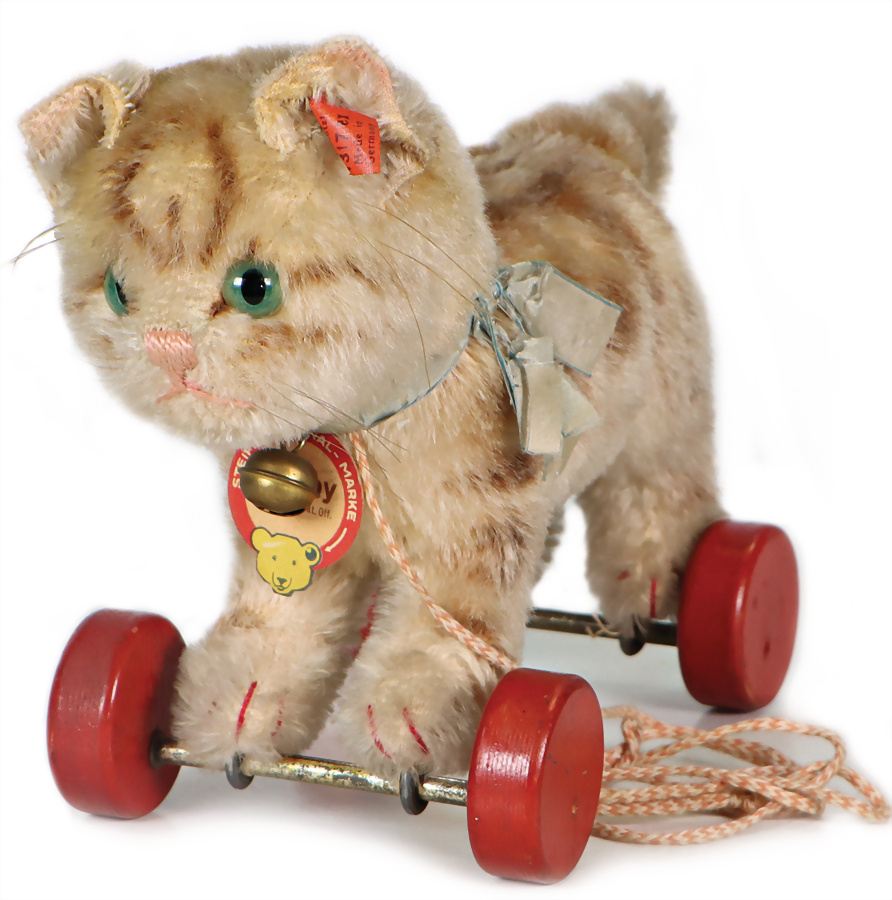 Katze TABBY auf Holz-Exzenter-Rädern, Artikel-Nr. 1317 EX, hergestellt am 13.12.1929, mit Knopf, Druckbuchstaben, langgezogenes f, unbespielte rote Fahne, Nr. auf Fahne: 1317 EX, Brustschild mit roter Aufschrift: Tabby Reg. U.s.pat.off., gestromeltes Mohair, gr. grüne Glasaugen, hellblaue Seidenschleife altersbed. etwas verschlissen, H: 17 cm, L: 27 cm, sehr schöner Zust., Handmuster aus dem Steiff-Archiv mit orig. Steiff-Archiv Anhänger