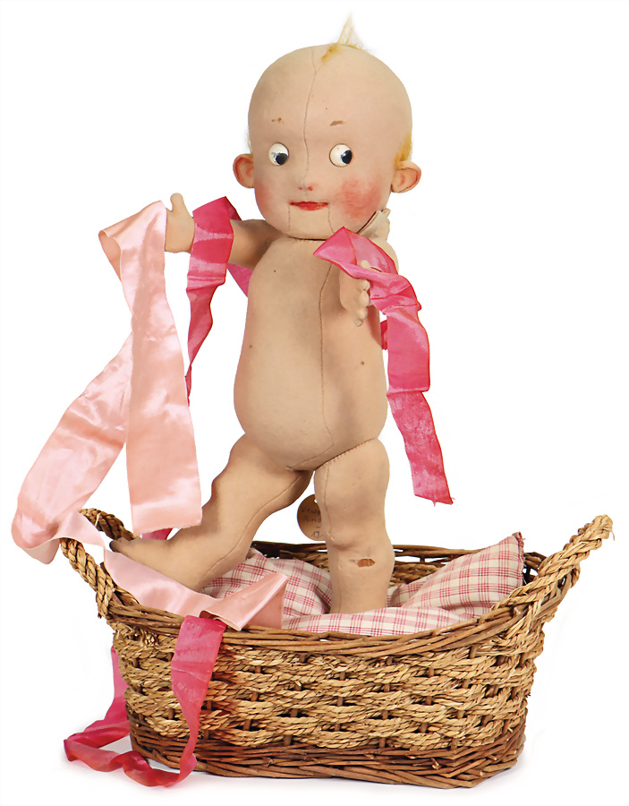 Kewpie Amor, ohne Artikel-Nr., hergestellt 1913, Musterstück, hergestellt ohne Knopf, Schild und Fahne, seitl. blickende Knopfaugen, leicht angedeutete aufgesetzte Haare, bewegl. Arme und Beine, kl. Filz-Flügelchen an den Schultern, unbekleidet, 34 cm, kl. Fehlstellen am Knie, extrem selten, ausgefallen, 37 cm, Handmuster aus dem Steiff-Archiv mit orig. Steiff-Archiv Anhänger