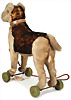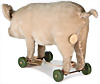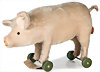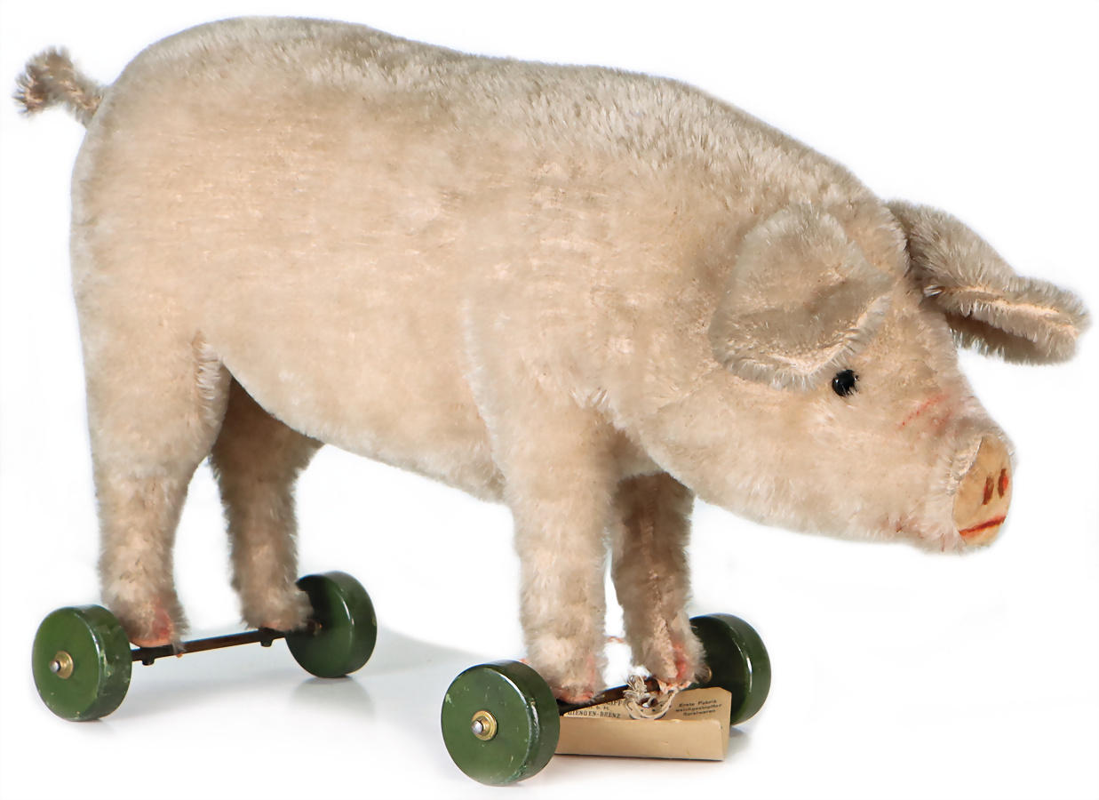 Sau, Artikel-Nr. 1328, hergestellt 1927, mit Knopf, Druckbuchstaben, langgezogenes f, Papier-Fahne mit Aufschrift: original geschützt 1328 A Germany, Schuhknopfaugen, Samt-Einsatz als Rüssel-Schnauze, Airbrush-Bemalung, an vereinzelten Stellen Mohair etwas licht, sonst schöner Zust., Ringelschwänzchen, auf Holz-Rädern, H: 26 cm, L: 41 cm, mit zusätzlichem Werkmuster Lager Schild, Handmuster aus dem Steiff-Archiv mit orig. Steiff-Archiv Anhänger