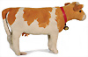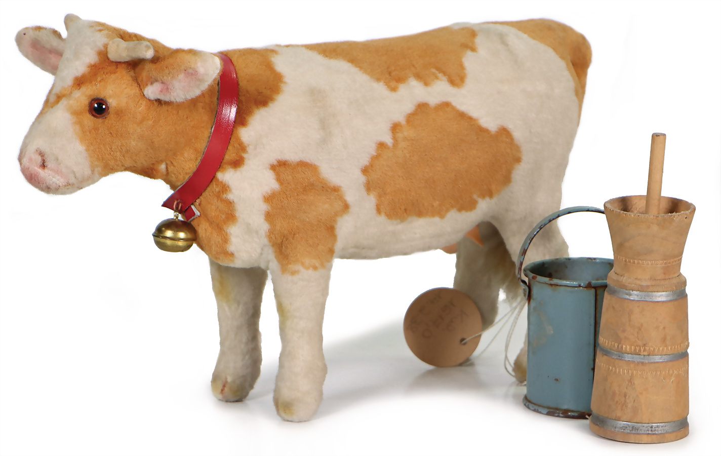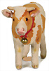 Kuh, Artikel-Nr. 1617,0, hergestellt am 14.02.1938, Kunstseidenplüsch, hellbraun, weiß gefleckt, stehend, Glasaugen, Hörner und Euter Samt, Mohair Schwanz, mit orig. Leder-Halsband und Glocke, H: 15 cm, L: 25 cm, sehr schöner Zust., Handmuster aus dem Steiff-Archiv mit orig. Steiff-Archiv Anhänger