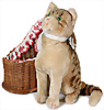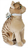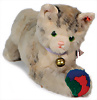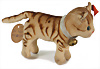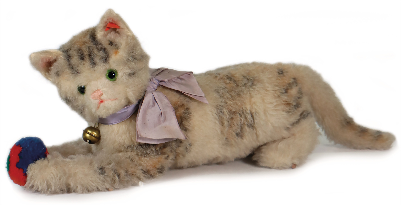 Katze, Artikel-Nr. 1410,0, hergestellt am 16.12.1927, Musterstück aus dem Steiff-Archiv, stehende Samt-Katze, gestromelt, mit grünen Glasaugen, mit Knopf und roter Fahne, Aufschrift: 1410,0, sowie mit Muster-Knopf, orig. Seidenschleife, H: 10 cm, L: 15 cm, Handmuster aus dem Steiff-Archiv mit orig. Steiff-Archiv Anhänger
