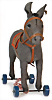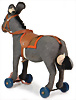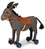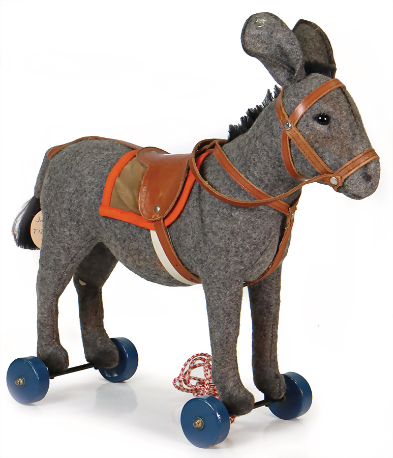 Filz-Esel, Artikel-Nr. 1122, hergestellt 1920, mit Knopf, Druckbuchstaben, langgezogenes f, weiße Papier-Fahne, etwas beschädigt, Aufschrift: Steiff Original geschützt 1122, Schuhknopfaugen, Leder-Zaumzeug, auf blauen Holz-Rollen, schwarzes Mohair als Mähne und Schweif, orig. Zugleine, H: 26 cm, L: 29 cm, unbespielter Zust.
