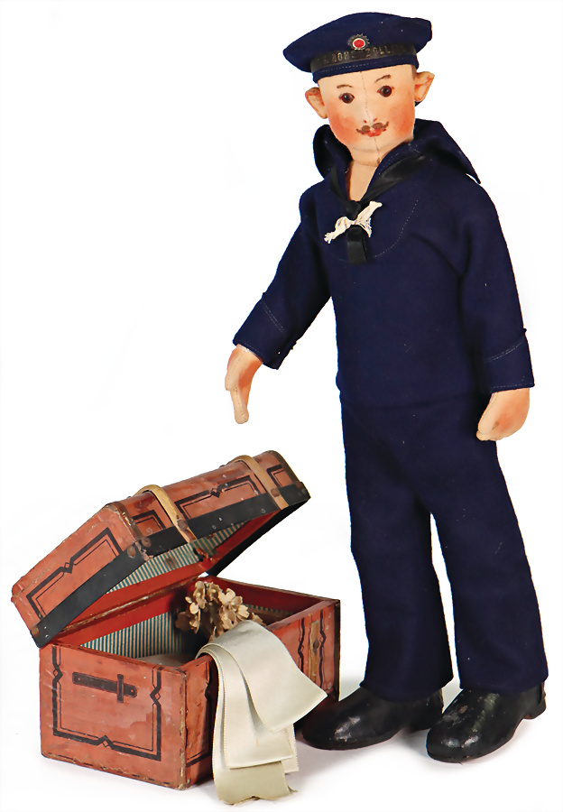 Filz-Puppe Matrose, Artikel-Nr. 35, hergestellt 1915, mit Knopf, braune Glasaugen, sehr schönes deutliches Airbrush mit erröteten Wangen, kl. Oberlippenbart, orig. Marine-Kleidung, Aufschrift auf Hut: RS.H.S.HOHENZOLLERN, schwarze Lederstiefel, bestickt mit 16 orig. Steiff Knöpfen, H: 37 cm, sehr guter Zust., Handmuster aus dem Steiff-Archiv mit orig. Steiff-Archiv Anhänger