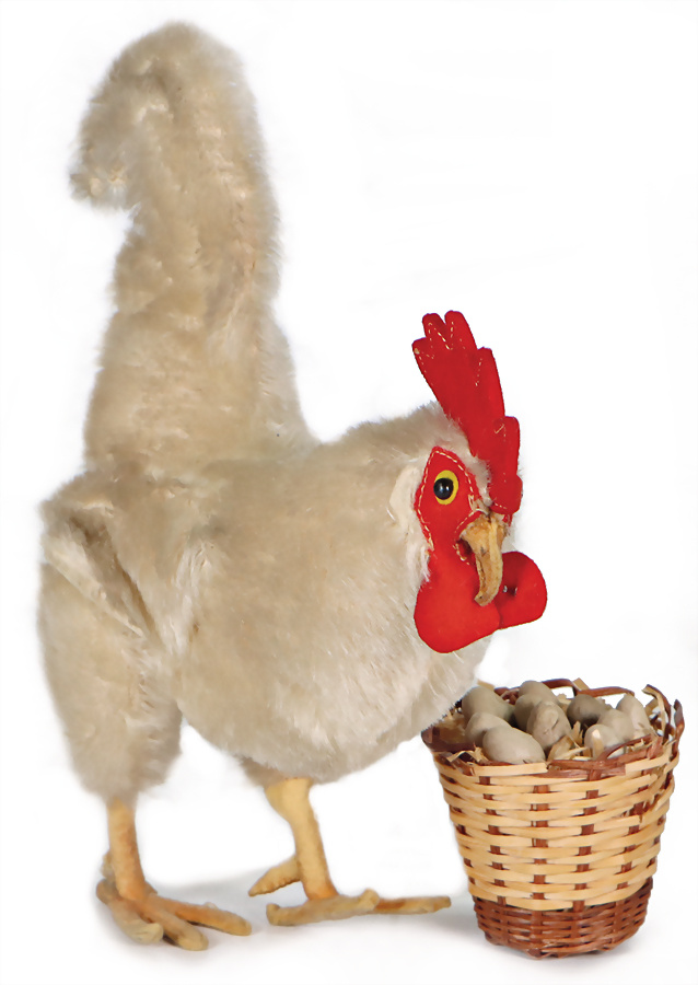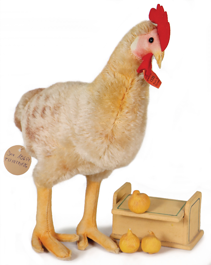 Henne, Artikel-Nr. 1328, hergestellt 1930, mit Knopf, Druckbuchstaben, langgezogenes f, unbespielte rote Fahne, Nr. auf Fahne: 1328, Filz-Gesicht, -Kamm und Beine, geflecktes Mohair, sehr schöner orig. Zust., H: 24 cm, L: 25 cm, Handmuster aus dem Steiff-Archiv mit orig. Steiff-Archiv Anhänger