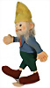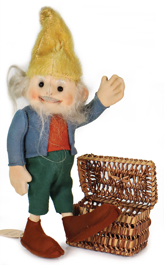 Gnom PUCK, Artikel-Nr. 20, hergestellt 1914, mit kl. Steiff-Knopf, kl. Schuhknopfaugen, gelbe Mohair-Mütze, Langmohair als Schnurrbart, Filz-Bekleidung, 25 cm, schöner unbespielter Zust., Handmuster aus dem Steiff-Archiv mit orig. Steiff-Archiv Anhänger