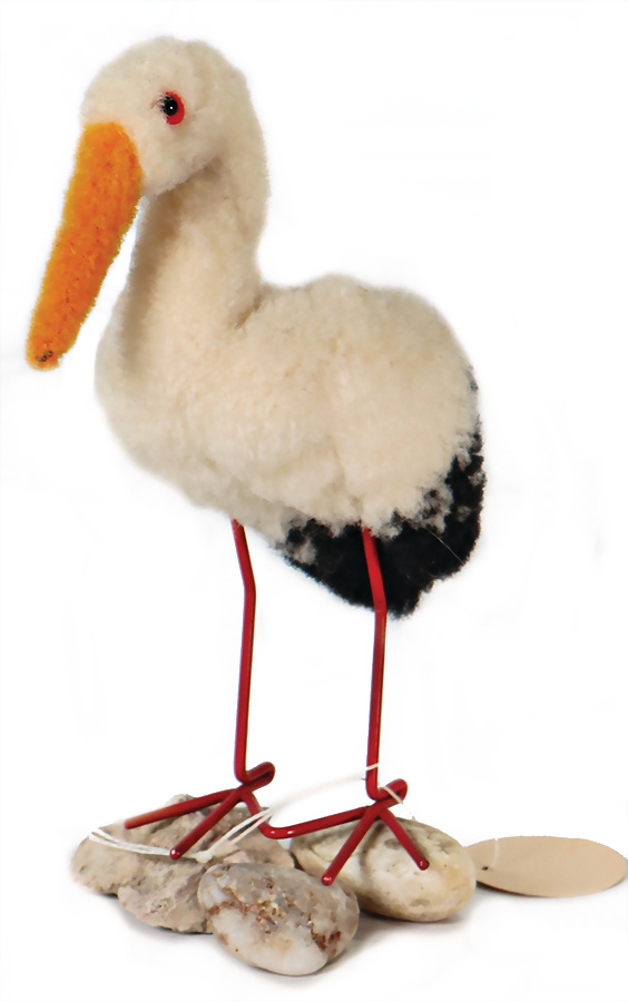 Wollminiatur Storch, Artikel-Nr. 1510,0, hergestellt 1936, auf Metall-Rädern, unterlegte kl. Schuhknopfaugen, H: 16 cm, sehr schöner unbespielter Zust., ausgefallen, Handmuster aus dem Steiff-Archiv mit orig. Steiff-Archiv Anhänger