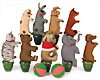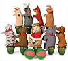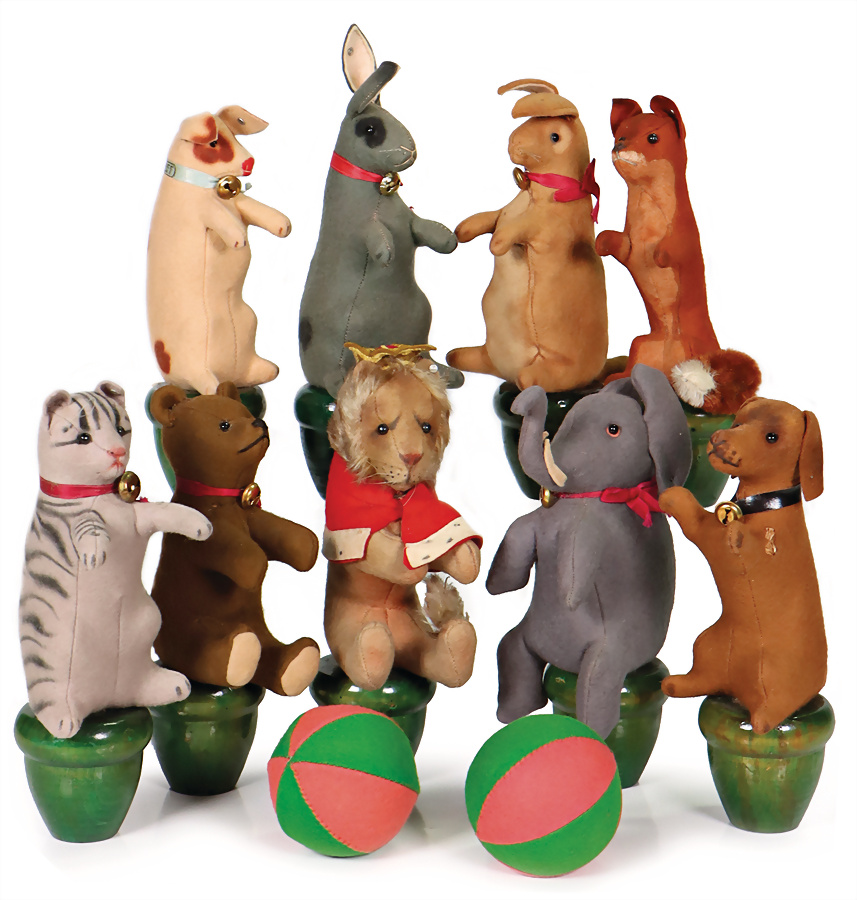 Kegelspiel, eines der Highlights der Steiff Auktion, Artikel-Nr. 4176, hergestellt 1908, gemischtes Tier-Programm mit 2 Filz-Bällen, Löwe als König mit Krone, darunter 2x Hase, grau und braun, 1 Dackel, Elefant, Katze, Schwein, Fuchs und Bär, alle Tiere mit kl. Steiff Knopf, sowie Seiden-Halsband mit Steiff-Schriftzug, 25 cm, unbespielter orig. Zust., selten, Handmuster aus dem Steiff-Archiv