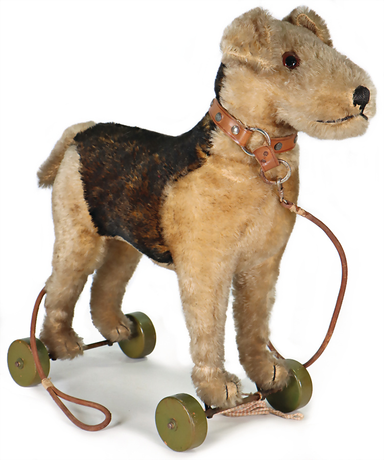 Hund AIREDALE-TERRIER, Artikel-Nr. 1335, hergestellt am 20.04.1927, auf Holz-Rollen, mit Knopf, Druckbuchstaben, langgezogenes f, rote etwas ausgeblichene Fahne, Nr. auf Fahne: 1335, gr. Glasaugen, mit orig. Leder-Halsband und -Leine, bespickt mit 8 orig. Steiff Knöpfen, an vereinzelten Stellen Mohair etwas licht, sonst sehr schöner Zust., H: 40 cm, L: 40 cm, Handmuster aus dem Steiff-Archiv mit orig. Steiff-Archiv Anhänger