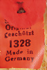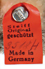 Filz-Figur Infanterist Leutnant, Artikel-Nr. 50, hergestellt 1914, mit Knopf, Druckbuchstaben, langgezogenes f, unbespielte weiße Papier-Fahne, Aufdruck: Steiff Original geschützt Nr. 50, blaue Glasaugen, sehr schönes Airbrush, eingesetztes Mohair Haar, mit Pickel-Haube, Aufschrift: 50, Filz-Kleidung, braune Schnürstiefel mit Leder-Gamaschen, 53 cm, ausdrucksstark, Handmuster aus dem Steiff-Archiv mit orig. Steiff-Archiv Anhänger