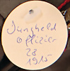 Jungheld, Offizier, hergestellt 1915, Artikel-Nr. 28, Filzpuppe mit royalblauen, fest eingesetzten Glasaugen, deutliches Airbrush, mit Knopf, Druckbuchstaben, langgezogenes f, sehr schön erhaltene weiße Fahne, hängt sehr fragil am Ohr, Filzmütze, Aufschrift 28 mit seitlichen vereinzelten Filzfehlern, graue Filzkleidung mit Gürtel und Säbel, kurze graue Filzhose royalblauer Filz-Strumpfhose, 28 cm, Handmuster aus dem Steiff-Archiv mit orig. Steiff-Archiv Anhänger