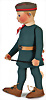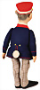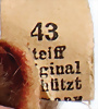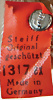 Dienstmann, hergestellt 1906, Artikel-Nr. 35, Filzpuppe mit Filz-Kopf, Druckbuchstaben, langgezogenes f, minimale Reste der weißen Fahne, Schuhknopfaugen, deutliches Airbrush im Gesicht, errötete Wangen, angedeuteter Oberlippenbart, leichte Filzfehler um das rechte Auge, Filzkleidung mit goldenen Knöpfen, gesteppte, rote Nähte, Seidenschluppe, Filzhose mit Karomuster, übergroße Lederschuhe, 38 cm, mit gelbem Abzeichen, Aufschrift Nr. 8, sehr schöner Orig.-Zustand, Handmuster aus dem Steiff-Archiv mit orig. Steiff-Archiv Anhänger