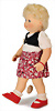 Puppe VERA, Artikel-Nr. 35, hergestellt 1948, Musterstück hergestellt ohne Knopf, Schild und Fahne, nur mit Ring am Handgelenk, Filz-Kopf, fest eingesetzte blaue Glasaugen, aufgesetztes lockige blonde Mohair Haare, kl. Filz-Mützchen mit Seiden-Bommel, orig. Kleidung, Filz-Sandaletten, 33 cm, unbespielter Zust., Handmuster aus dem Steiff-Archiv mit orig. Steiff-Archiv Anhänger