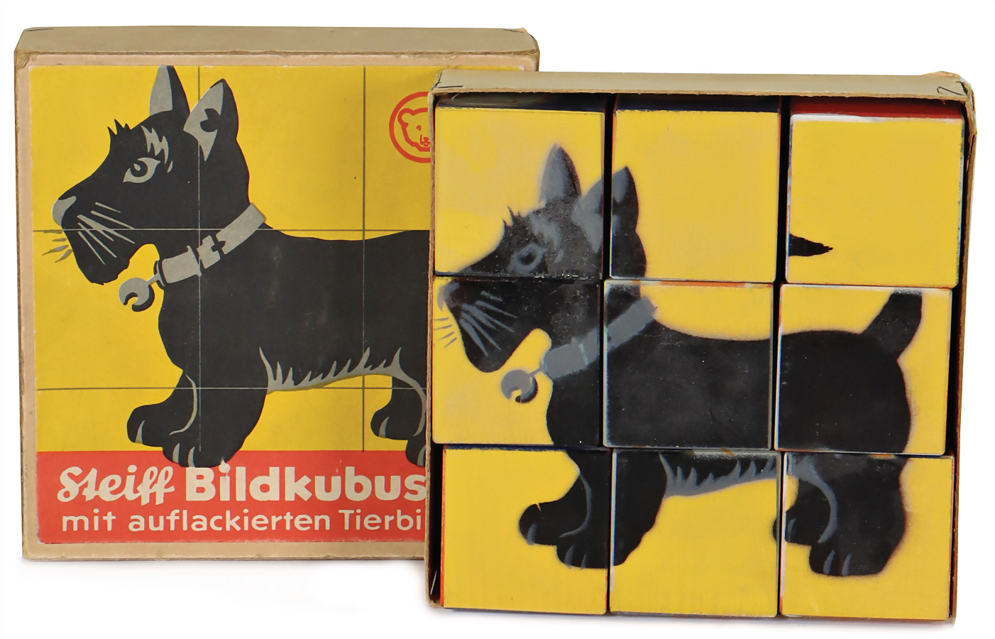BILDKUBUS, Artikel-Nr. 9805, hergestellt 1937, mit lackierten Tierbildern, vollständig, im orig.-Kart., unbespielter Zust., Handmuster aus dem Steiff-Archiv mit orig. Steiff-Archiv Anhänger