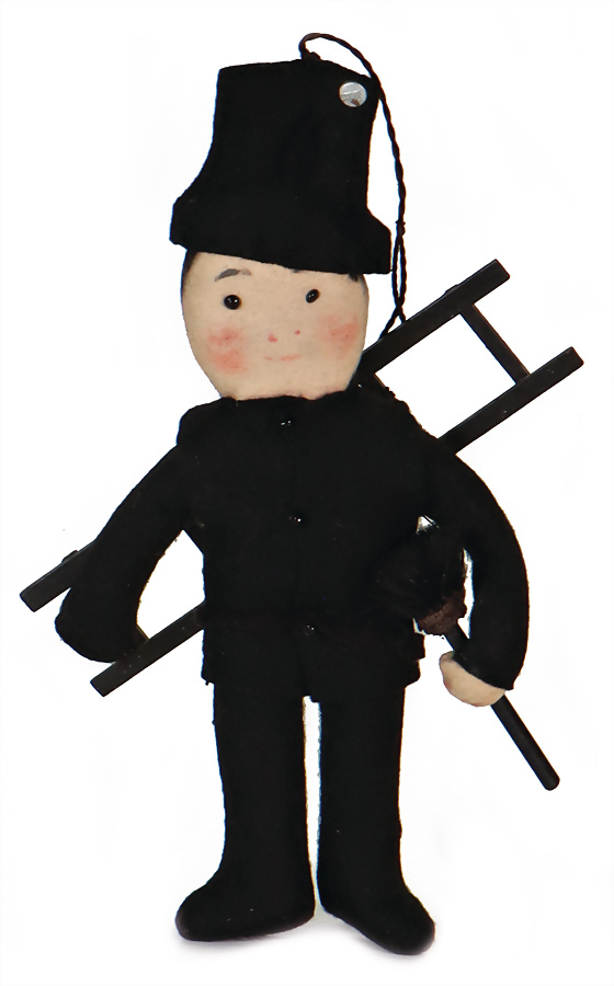 Glücksfeger, kl. Filz-Auto-Puppe, Artikel-Nr.15,2, hergestellt 1938, mit Knopf, Druckbuchstaben, langgezogenes f, minim. Reste der Fahne, mit Leiter und Besen, mit zwei untersch. großen Schuhknopfaugen, leichtes Airbrush, 15 cm, selten, Handmuster aus dem Steiff-Archiv mit orig. Steiff-Archiv Anhänger