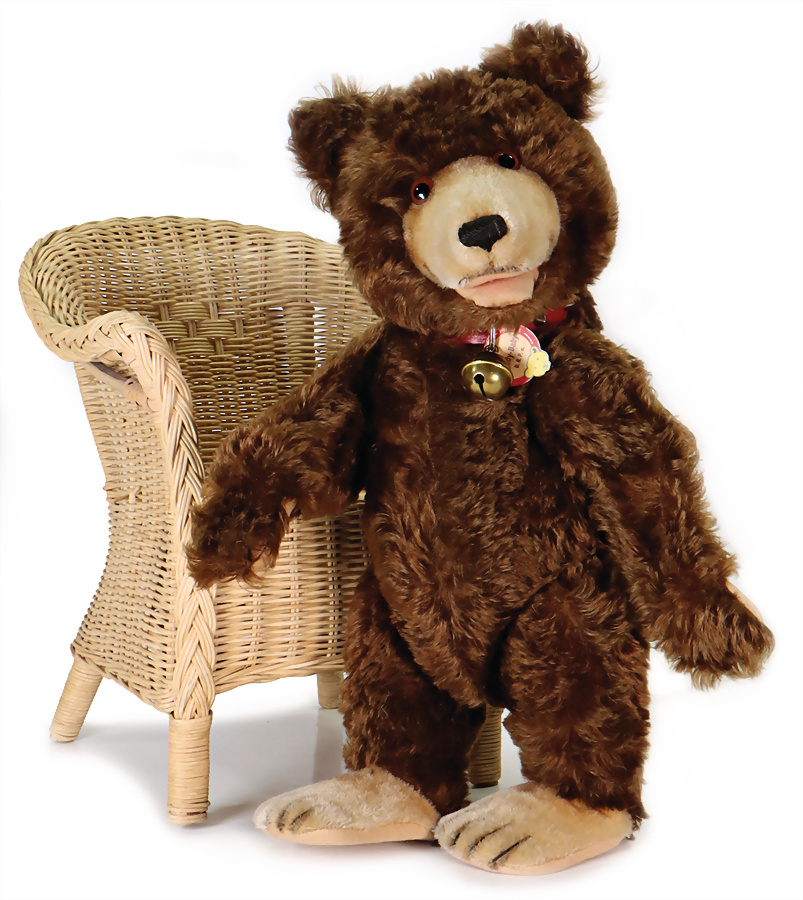 TEDDY-BABY, Artikel-Nr. 7332,2, hergestellt am 07.02.1930, mit Knopf, Druckbuchstaben, langgezogenes f, minim. Reste der roten Fahne, orig. Leder-Halsband bespickt mit 2 Steiff Vorkriegs-Knöpfen, Aufschrift mit roter Schrift: Teddy-Baby d.r.p.a., offenes Maul, deutl. Airbrush, Filz-Tatzen in unbespieltem Zust., schönes volles dunkelbraunes Mohair, 45 cm, Handmuster aus dem Steiff-Archiv mit orig. Steiff-Archiv Anhänger