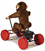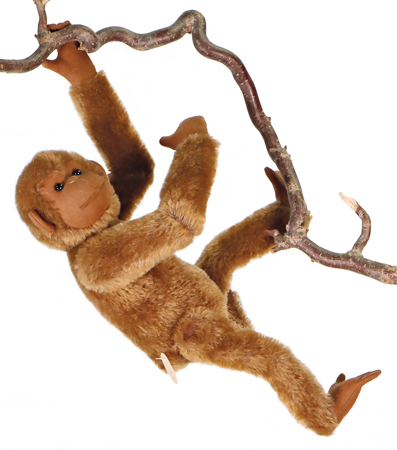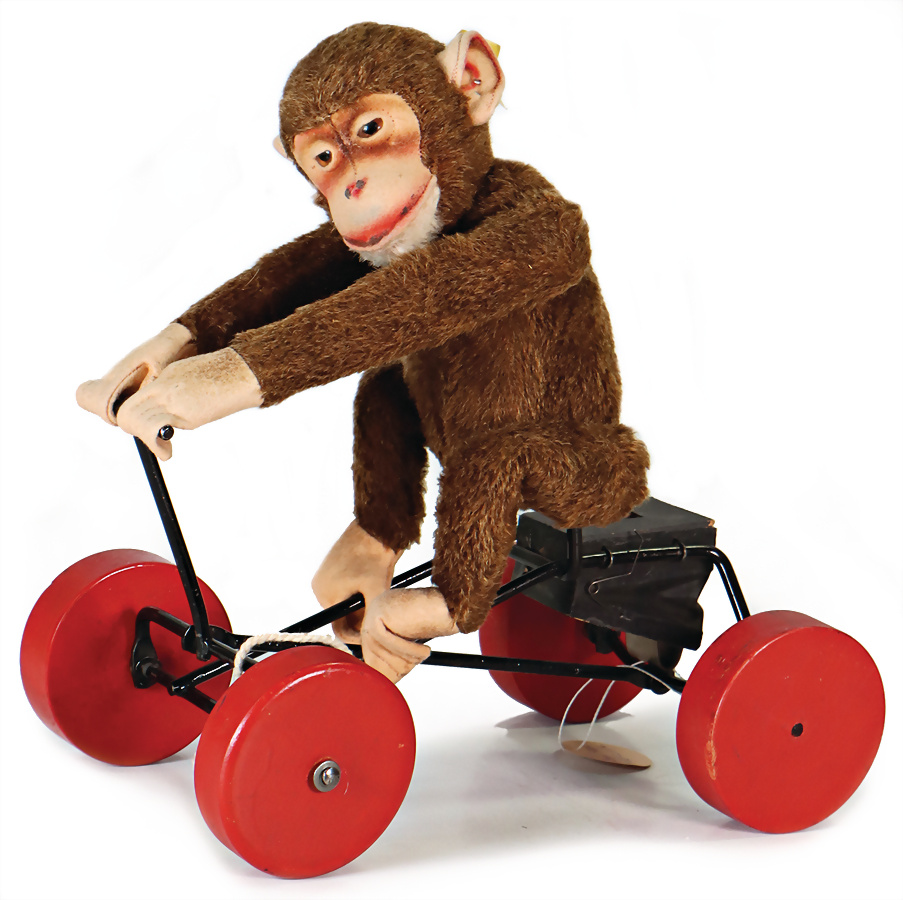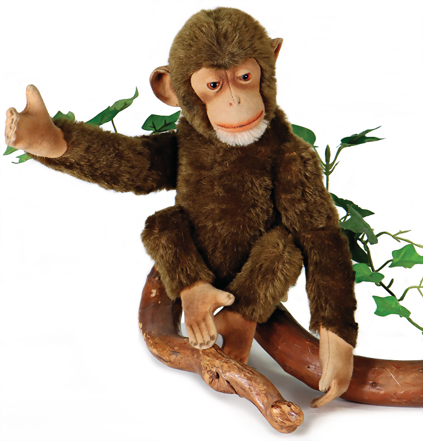 PURZEL-SCHIMPANSE, Artikel-Nr. 9326, hergestellt 1909, mit Uhrwerk, nicht funktionstüchtig, eingesetzte Glasaugen, schönes volles Mohair, Filz-Gesicht mit deutl. Airbrush, Filz-Ohren, -Hände und -Füße, schöner unbespielter orig.-Zust., Handmuster aus dem Steiff-Archiv mit orig. Steiff-Archiv Anhänger