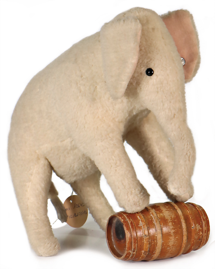 Elefant, Artikel-Nr. 1517,0, hergestellt 1905, Musterstück mit gr. Muster-Knopf, Lammplüsch, rosafarbener Samteinsatz in der Ohrinnenseite, kl. offene Naht hinter dem rechten Ohr, H: 16 cm, L: 19 cm, sehr schöner Zust., Handmuster aus dem Steiff-Archiv mit orig. Steiff-Archiv Anhänger