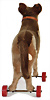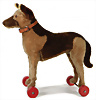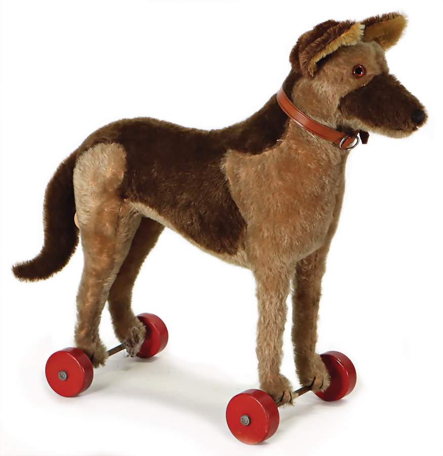POLIZEI-HUND, Artikel-Nr. 1335, hergestellt 1925, auf Holz-Rädern, Glasaugen, H: 42 cm, L: 45 cm, orig. Steiff-Leder-Halsband ohne Zugleine, dunkelbraunes und braunes Mohair, an vereinzelten Stellen etwas licht, Handmuster aus dem Steiff-Archiv mit orig. Steiff-Archiv Anhänger