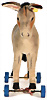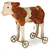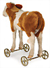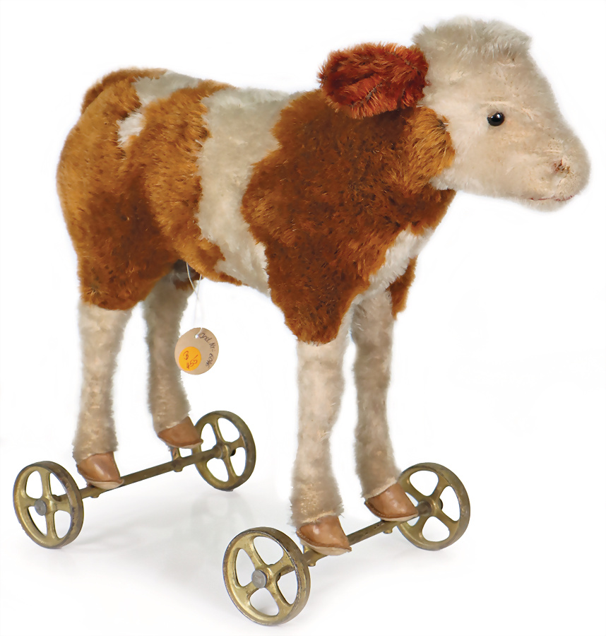 Kalb, Artikel-Nr. 6332, hergestellt 1916-1917, Musterstück mit Muster-Knopf, auf Gussspeichen-Rädern, Schuhknopfaugen, geflecktes rostbraunes sowie beiges Mohair, lederne Hufe, H: 30 cm, L: 40 cm, schöner Zust., Handmuster aus dem Steiff-Archiv mit orig. Steiff-Archiv Anhänger