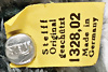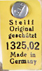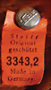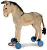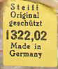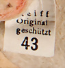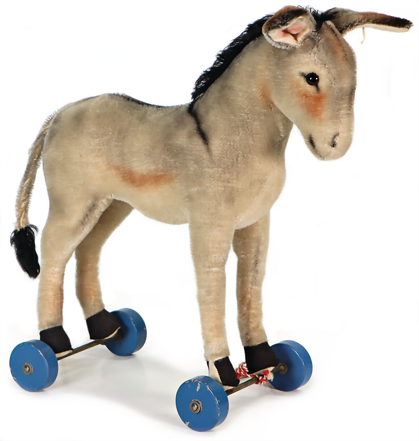 ESEL, Artikel-Nr. 1329, hergestellt am 11.11.1938, mit Knopf, Druckbuchstaben, langgezogenes f sowie gelbe Fahne. Nr. auf Fahne: 1329, Schuhknopfaugen, Kurzmohair auf blauen Holz-Rollen, H: 32 cm, L: 32 cm, an minim. Stellen auf der linken Seite Mohair etwas licht, sonst sehr schöner Zust., Handmuster aus dem Steiff-Archiv mit orig. Steiff-Archiv Anhänger