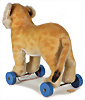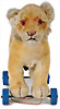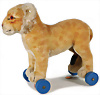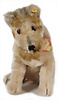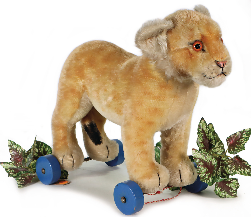 JUNG-LÖWE, Artikel-Nr. 1329, hergestellt am 26.02.1939, mit Knopf, Druckbuchstaben, langgezogenes f, Reste der gelben Fahne, auf blauen Holz-Rollen, geflecktes Mohair, minim. kl. nachgedunkelte Stelle unter dem linken Vorderlauf, H: 33 cm, L: 37 cm, sehr schöner Zust., Handmuster aus dem Steiff-Archiv mit orig. Steiff-Archiv Anhänger