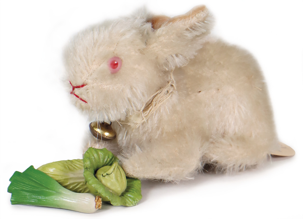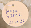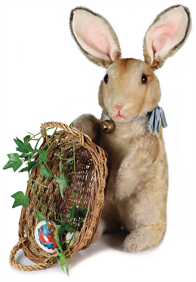 Hase, Artikel-Nr. 4350,2, hergestellt am 11.12.1936, aufwartend, bewegl. Kopf und Arme, braun/weißes Mohair, Filz-Innenohr, 56 cm, sehr schöner orig.-Zust., Handmuster aus dem Steiff-Archiv mit orig. Steiff-Archiv Anhänger