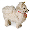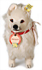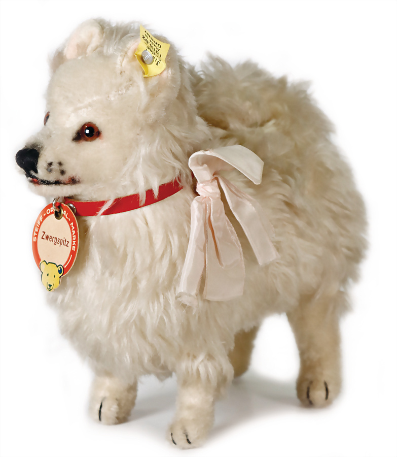 ZWERG-SPITZ, Artikel-Nr. 1318,02, hergestellt 1940, mit Knopf, Druckbuchstaben, langgezogenes f, mit unbespielter gelber Fahne, Nr. auf Fahne: 1318,02, Brustschild mit rotem Schriftzug: Zwerg-Spitz, Glasaugen, sehr schönes volles weißes Mohair, sehr schöner Zust., H: 19 cm, L: 17 cm, Handmuster aus dem Steiff-Archiv mit orig. Steiff-Archiv Anhänger