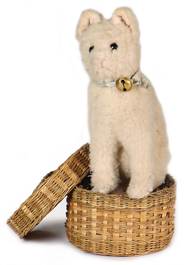 Katze, Artikel-Nr. KAZ12 SIZT, hergestellt 1904, Lammplüsch, kl. Schuhknopfaugen, sitzend, Seiden-Halsband, H: 14 cm, Handmuster aus dem Steiff-Archiv mit orig. Steiff-Archiv Anhänger