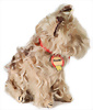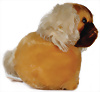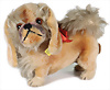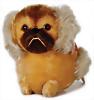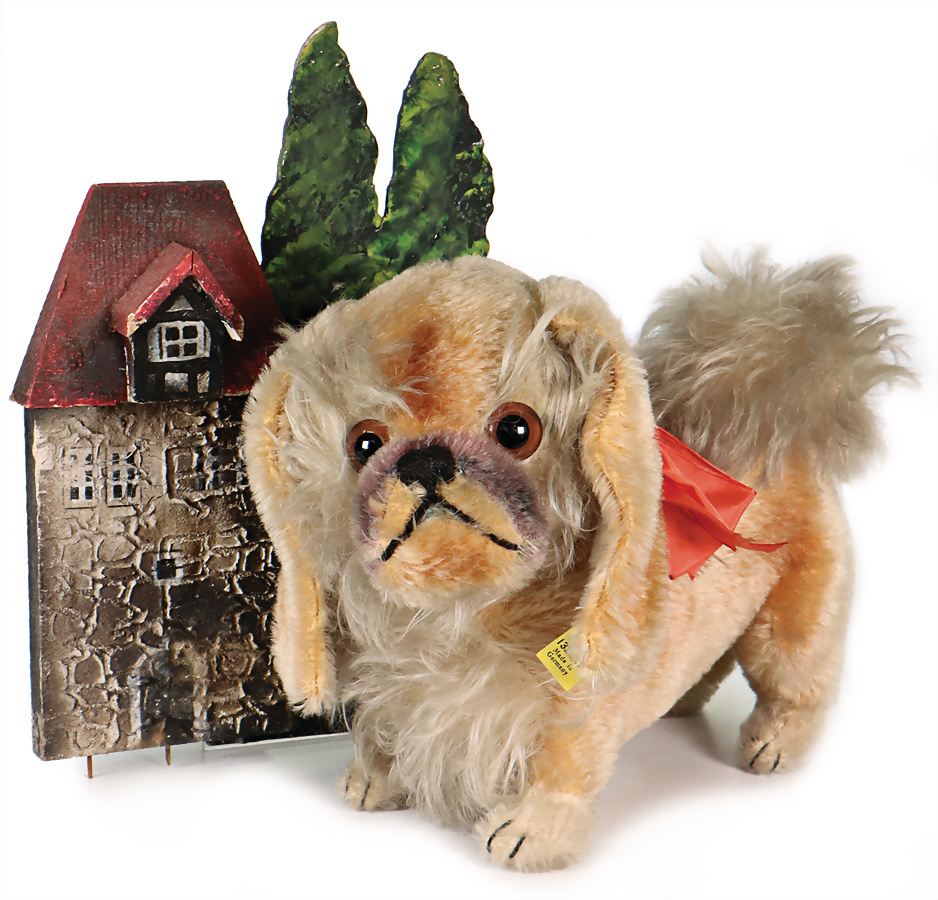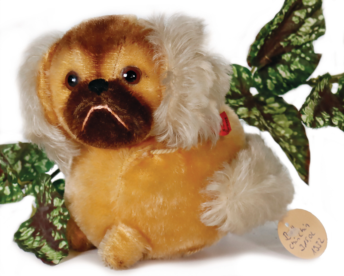 Hund, CHIN CHIN, Artikel-Nr. 1322,02, hergestellt am 10.07.1931, mit Knopf, Druckbuchstaben, langgezogenes f, unbespielte gelbe Fahne, Nr. auf Fahne: 1322,02, gr. Glasaugen, stehend, drehbarer Kopf, sehr schöne Farbgebung des Mohairs, Langmohair auf Brust, Schwanz und über den Augen, H: 20 cm, L: 26 cm, unbespielter orig.-Zust., Handmuster aus dem Steiff-Archiv mit orig. Steiff-Archiv Anhänger