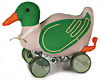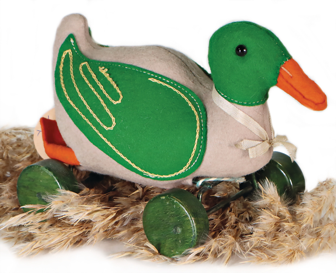 WACKEL-ENTE, Artikel-Nr. 2110,4,2EX, hergestellt am 18.07.1929, auf Holz-Exzenter-Rädern, kl. Schuhknopfaugen, H: 11 cm, L: 14 cm, unbespielter orig.-Zust., Handmuster aus dem Steiff-Archiv mit orig. Steiff-Archiv Anhänger