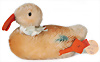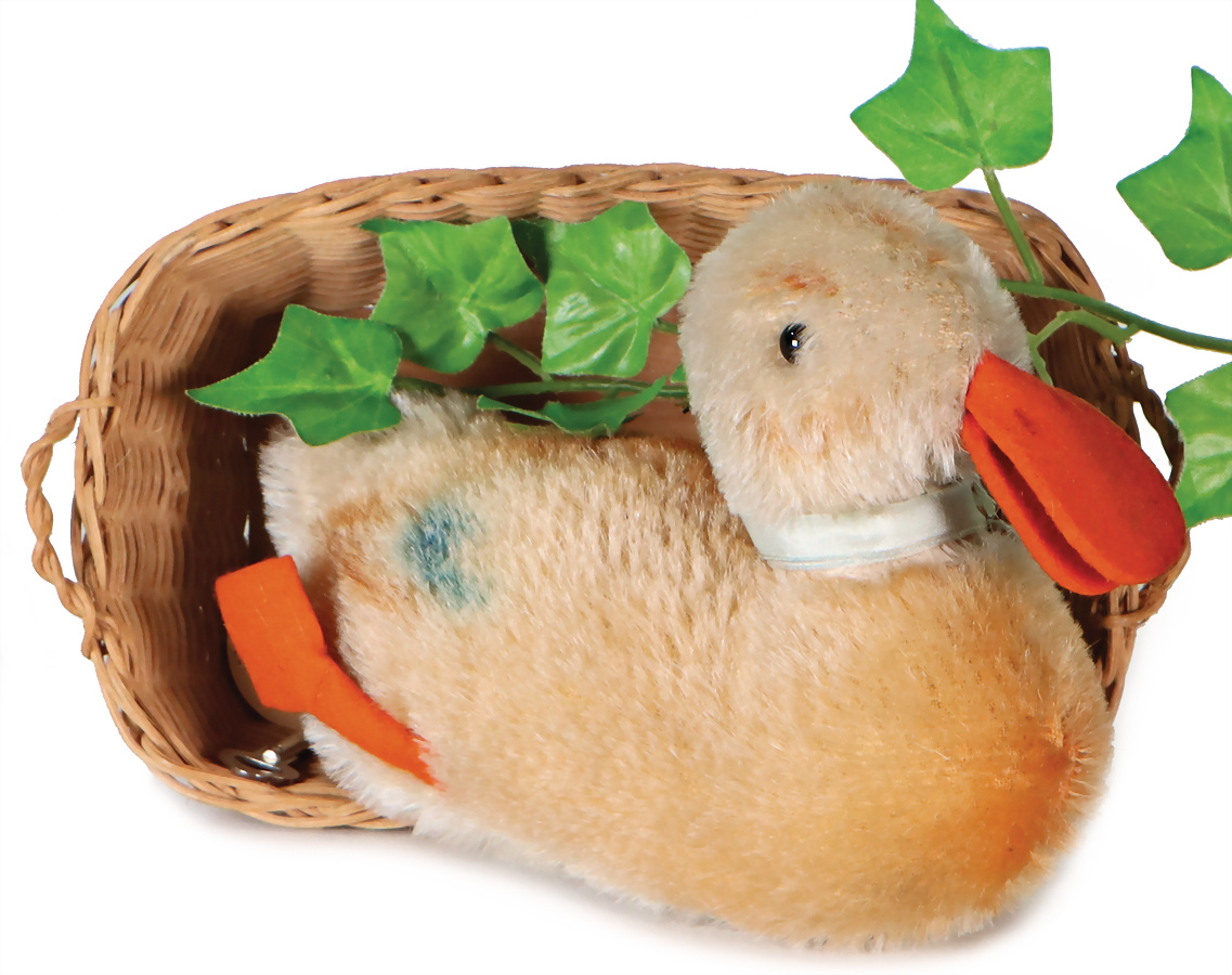SPIEL-ENTE, Artikel-Nr. 2312, hergestellt 1929, mit Knopf, Druckbuchstaben, langgezogenes f, unbespielte rote Fahne, Nr. auf Fahne: 2312, Schuhknopfaugen, Filz-Schnabel und -Füße, H: 12 cm, L: 19 cm, Handmuster aus dem Steiff-Archiv mit orig. Steiff-Archiv Anhänger