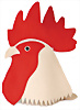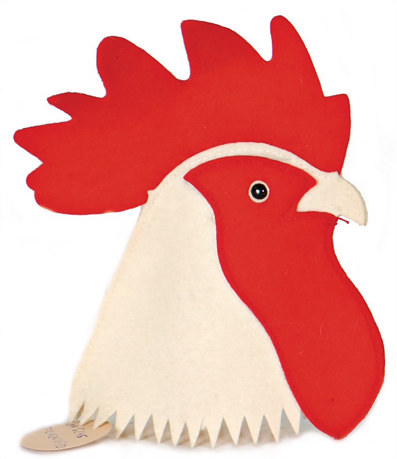 EIERHÜLLE HAHNENKOPF, Artikel-Nr. 4134, Filz-Kopf, unterlegte Schuhknopfaugen, unbespielter orig.-Zust., H: 15 cm, L: 12 cm, Handmuster aus dem Steiff-Archiv mit orig. Steiff-Archiv Anhänger