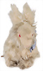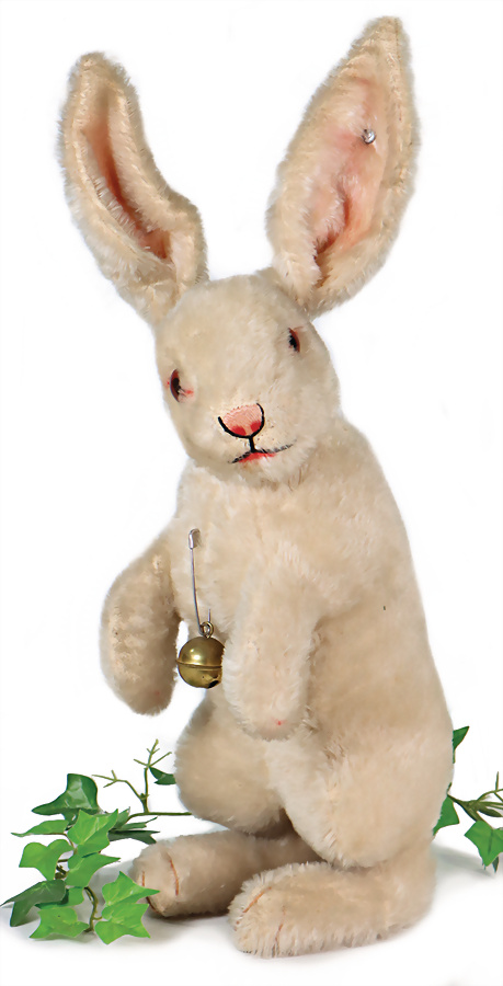 Hase, Artikel-Nr. 4344,2, hergestellt 1927, mit Knopf, Druckbuchstaben, langgezogenes f, gr. Glasaugen, aufwartend, drehbarer Kopf, weißes Mohair, Innenohr leicht rosa getönt, Airbrush Akzente im Gesicht, 48 cm, sehr schöner Zust., Kahlstelle am Rücken, Handmuster aus dem Steiff-Archiv mit orig. Steiff-Archiv Anhänger